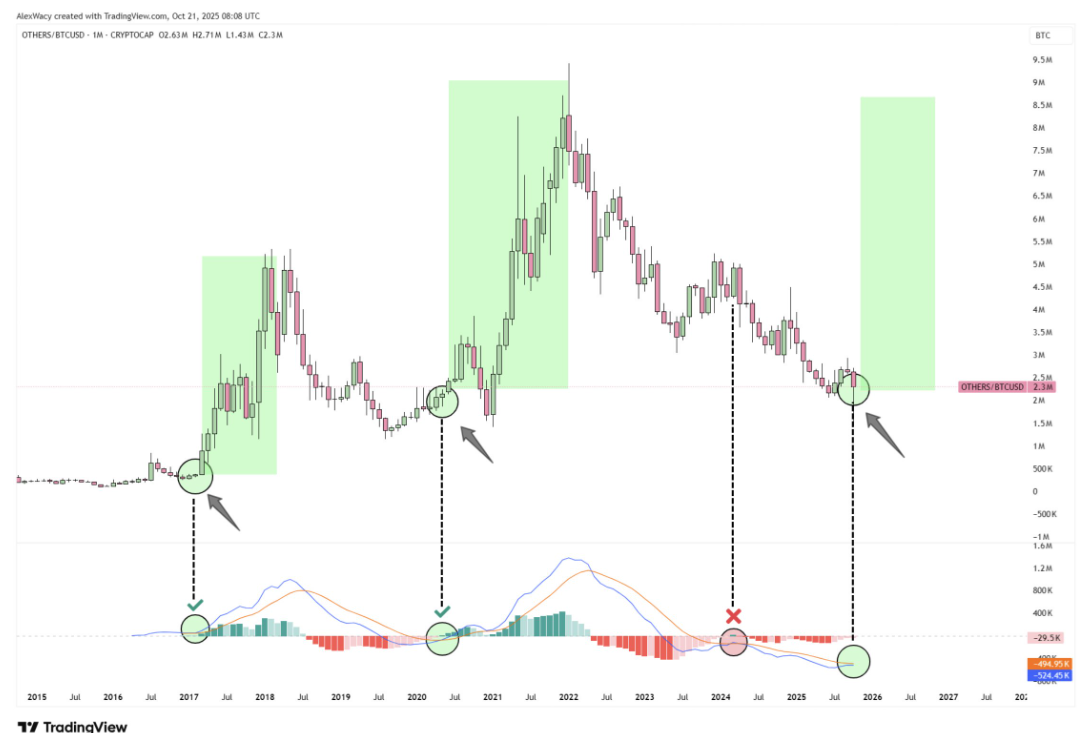 WHALES ARE CLEARING THE FIELD.Resistance flipped. Cup formed.2021 delivered a 400% pump.2025 is already echoing it.This is the calm before the altcoin storm. pic.twitter.com/JU4dx5kj64— Merlijn The Trader (@MerlijnTrader) October 20, 2025